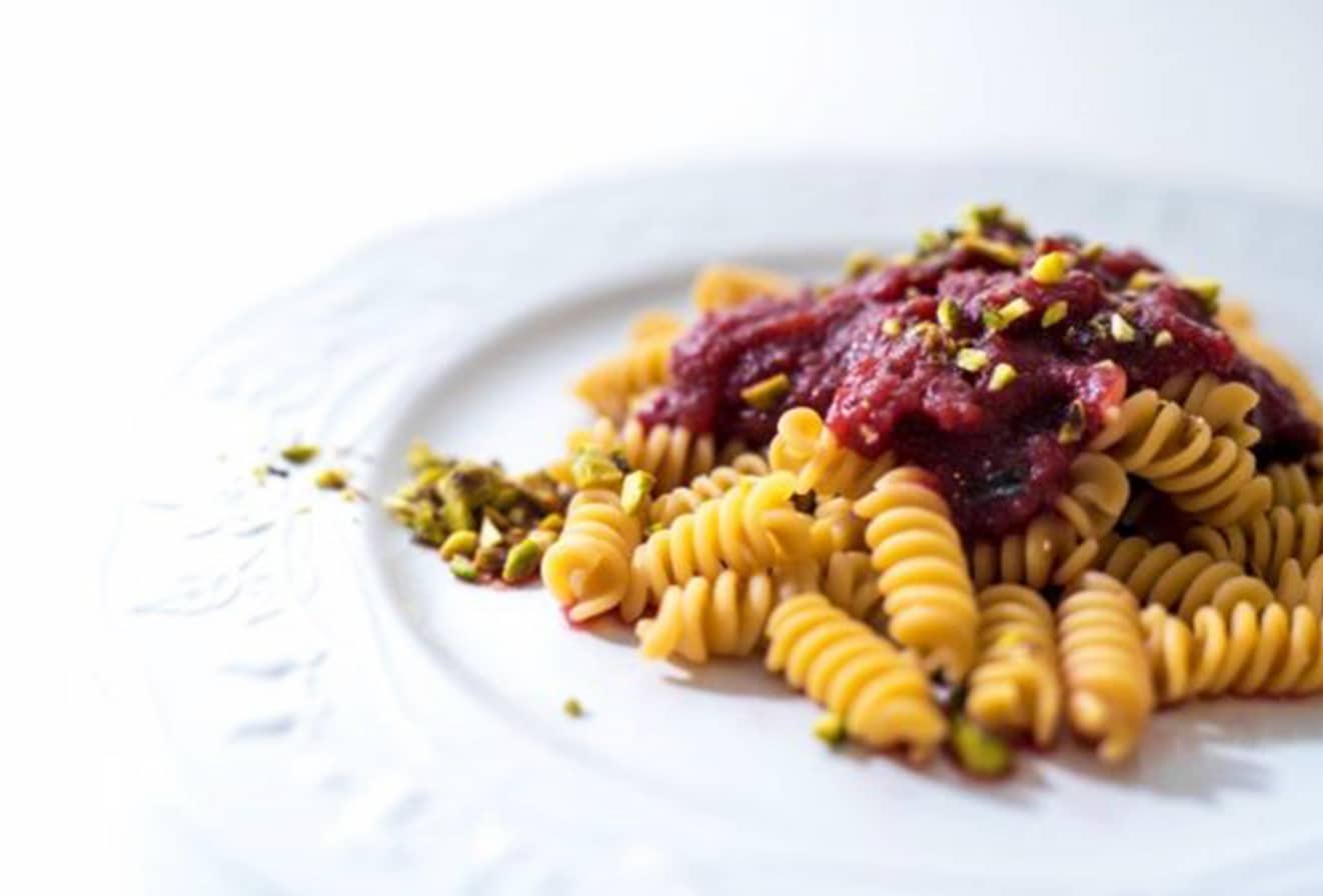 Procedimento Sbucciate, lavate e tagliate a pezzetti le verdure. Mettete tutto in una pentola aggiungete un pizzico di sale. Terminata la cottura, frullate tutto con un frullatore ad immersione. Rimettete sul fuoco il sugo ottenuto e cuocete per circa 15 minuti cercando di farlo restringere. A piacere aggiungere basilico, origano, ecc… Condire la pasta e servirla con pistacchi tritati grossolanamente.
